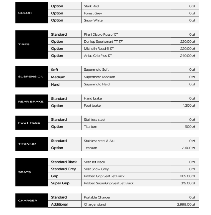 Możliwość dopasowania VARG SM pod siebie: tryby mocy, ustawienia regeneracji, opcje felg i ogumienia, oraz pakiety akcesoriów. Jeśli chcesz — przygotujemy ofertę z konfiguracją, podpowiemy jakie ustawienia sprawdzą się w mieście, a jakie na torze.