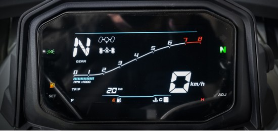 - Wyświetlacz: 7-calowy kolorowy TFT z automatycznym przełączaniem trybu dzień/noc, wyświetlający prędkość, obroty, poziom paliwa, zegar, temperaturę chłodzenia i wskaźniki.