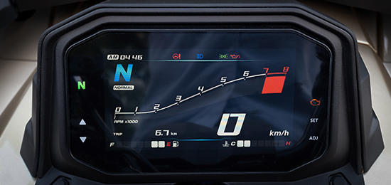 - Wyświetlacz: 7-calowy kolorowy TFT z automatycznym przełączaniem trybu dzień/noc, wyświetlający prędkość, obroty, poziom paliwa, zegar, temperaturę płynu chłodzącego, licznik kilometrów i wskaźniki biegu/napędu.